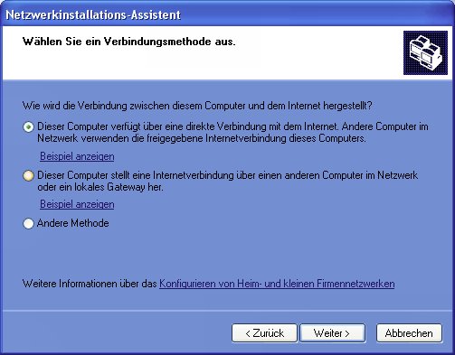 Im folgenden Fenster legen Sie fest, ob Ihr Rechner auch für das Internet zuständig ist und weitere Rechner über diesen PC auf das Internet zugreifen.