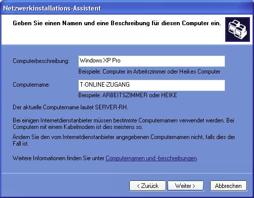 Damit die einzelnen Rechner im Netzwerk miteinander kommunizieren können, muss jedem PC ein Name zugewiesen werden, diesen tragen Sie im Feld "Computername" ein. Unter "Computerbeschreibung" haben Sie die Möglichkeit eine genauere Charakterisierung einzutragen. |