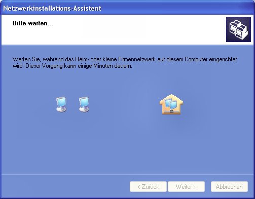 vorgegebenen Namen "MSHEIMNETZ" können Sie beliebig ändern. Das jetzt folgende Dialogfeld dient der Überprüfung der vorgenommenen Einstellungen, die Sie gegebenenfalls über die Schaltfläche "Zurück" nochmals ändern können. Die Bestätigung mit "Weiter" startet die Einrichtung des Netzwerks.