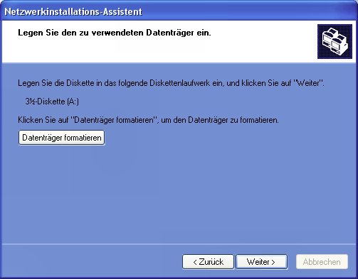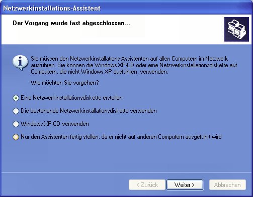Um alle Computer in das Netzwerk zu integrieren, müssen Sie nun auf jedem Rechner die notwendigen Einstellungen vornehmen. Das kostet einiges an Handarbeit und Zeit. Der Netzwerkinstallations-Assistent kann Ihnen diese Arbeit mit der Hilfe einer Installationsdiskette aber abnehmen. Aktivieren Sie dazu die Option "Eine Netzwerkinstallationsdiskette erstellen".